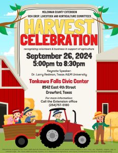 The fourth annual McLennan County Harvest Celebration will be held Thursday, September 26th at the Tonkawa Falls Civic Center, located at 8542 E 4th St, Crawford, TX 76638 in Tonkawa Park adjacent to the Crawford Pirate Football Stadium.  It will be an opportunity to visit with agriculture supporters as well as ag vendors, eat a steak meal and learn about Extension result demonstration work completed in McLennan County.  Participants will also have an opportunity to take home great door prizes.