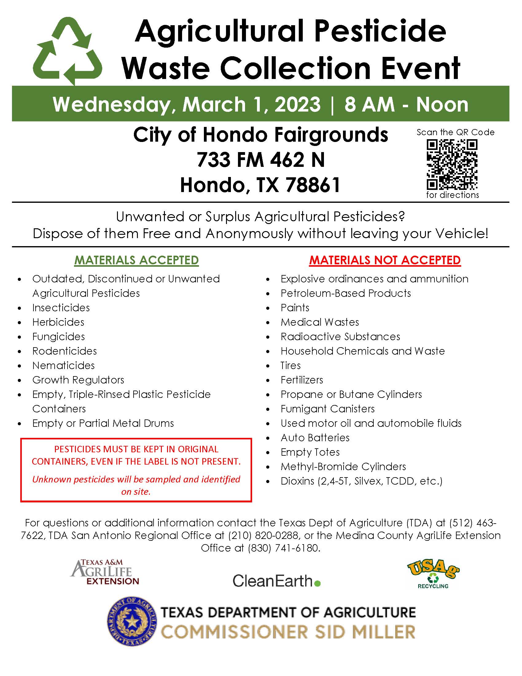 For questions contact the TDA at 512.463.7622, TDA SA Regional Office at 210.820.0288 or the Medina County AgriLife Extension Office at 830.741.6180.