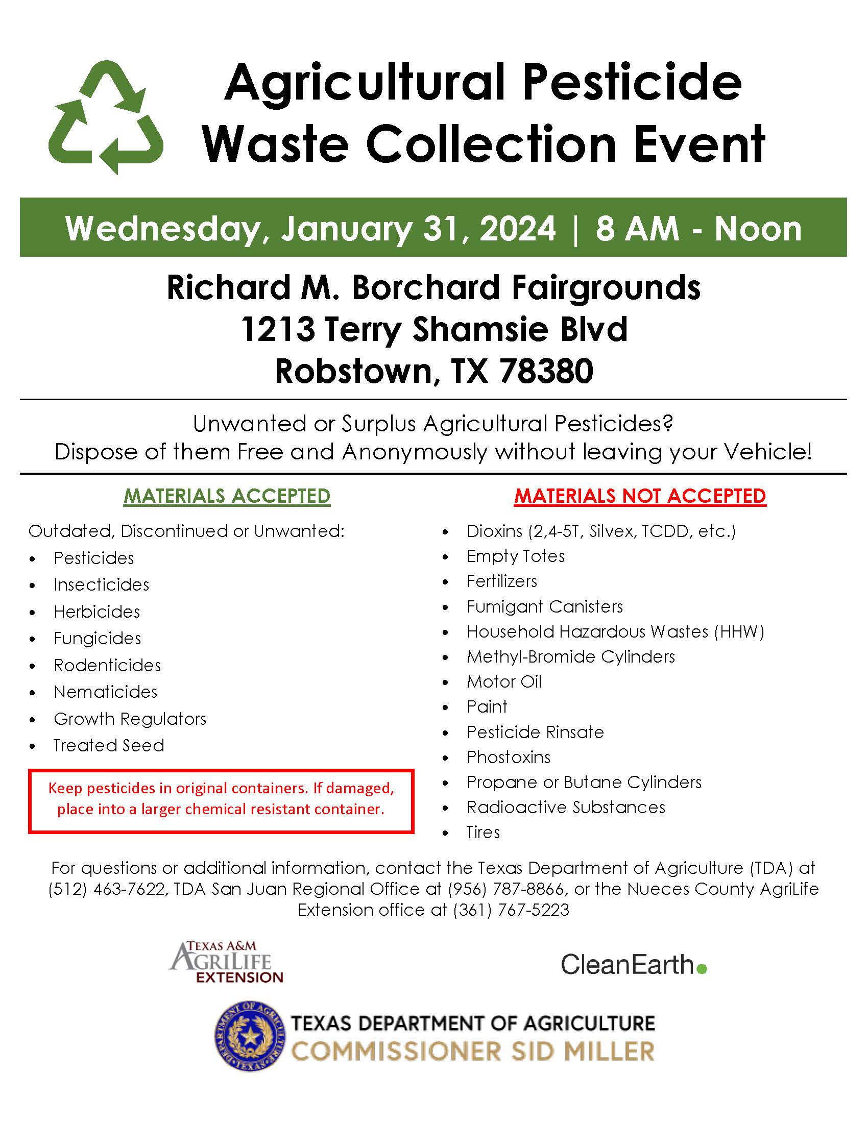 The TDA, in cooperation with Texas AgriLife Extension, operates agricultural pesticide waste and pesticide container collection activities statewide. The next pesticide waste collection event will be held early in 2024!