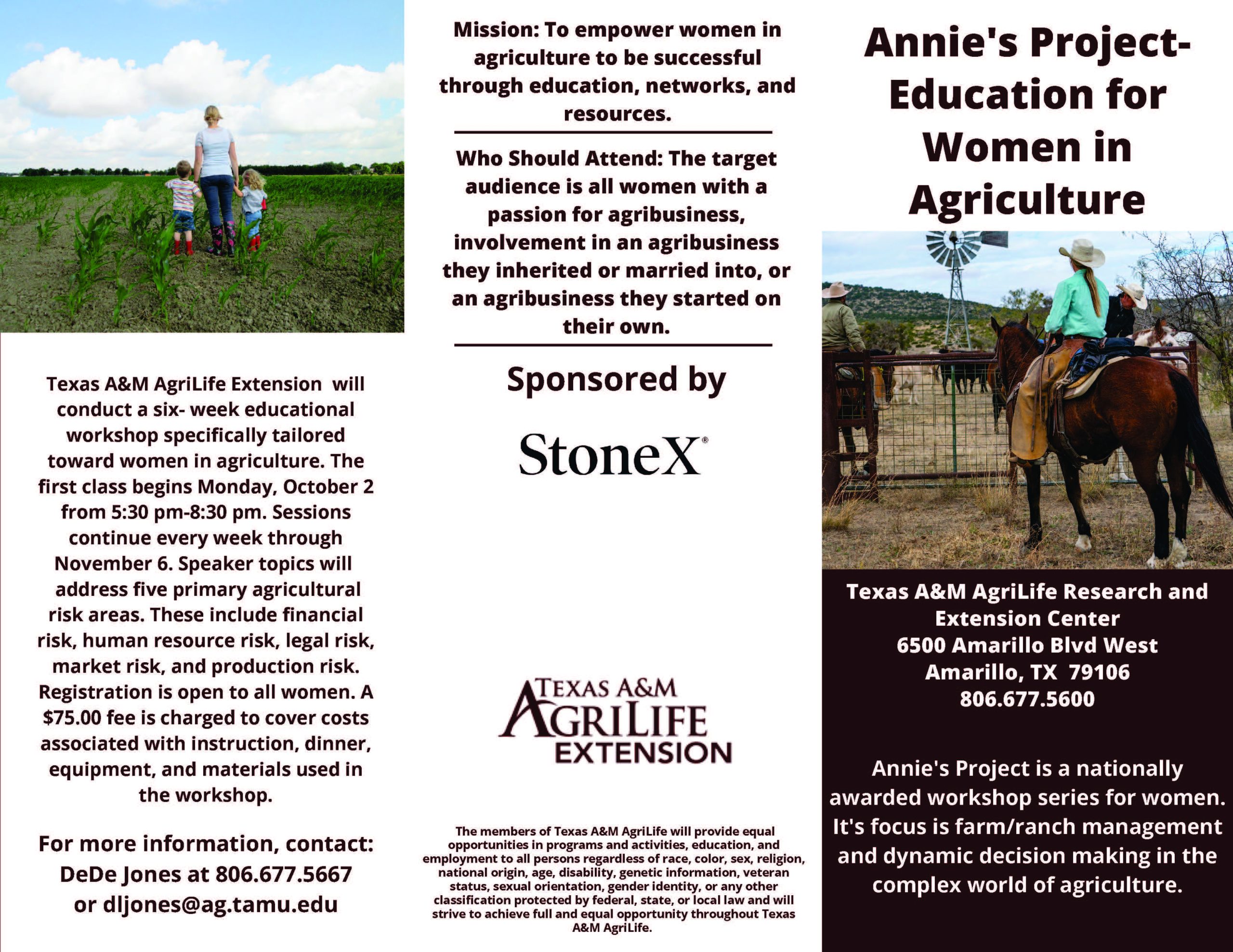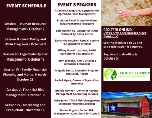Topics covered include human resource management, policy, finance, law, marketing, insurance, and mental health. The class is targeted exclusively to women in agriculture.