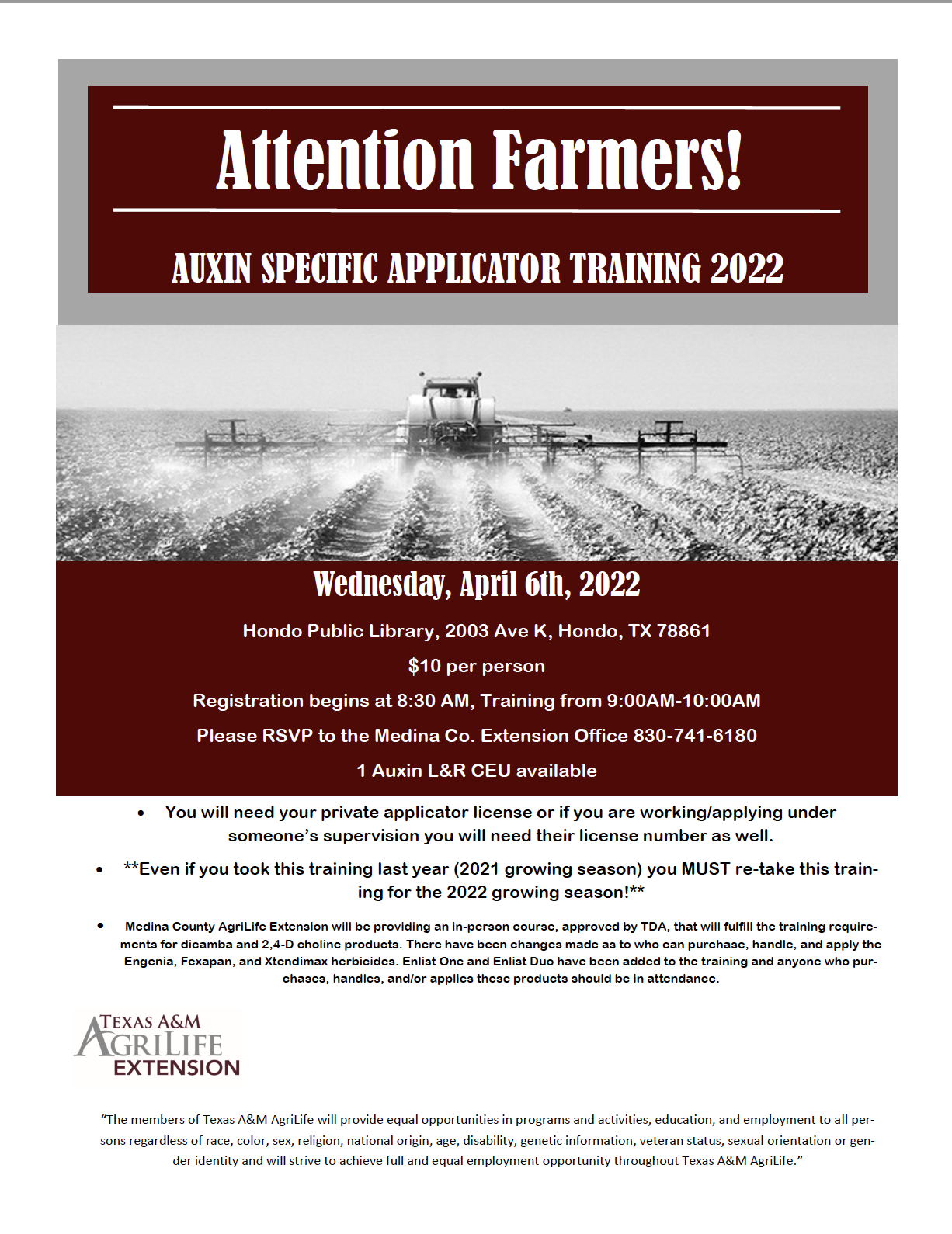 Make sure you RSVP for the Medina County Auxin Applicator Training. This training meets all the requirements needed for the 2022 growing season as well as offers an Auxin Laws & Regulations CEU. All you need is your private applicator’s license and if you are working under someone, you will need theirs as well. The training may also be taken online.