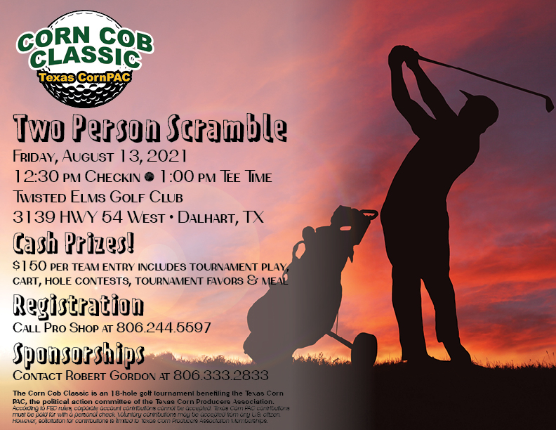Join us on August 13th for the Corn Cob Classic, a two-person scramble benefiting the Texas Corn PAC, the political action committee of the Texas Corn Producers Association.