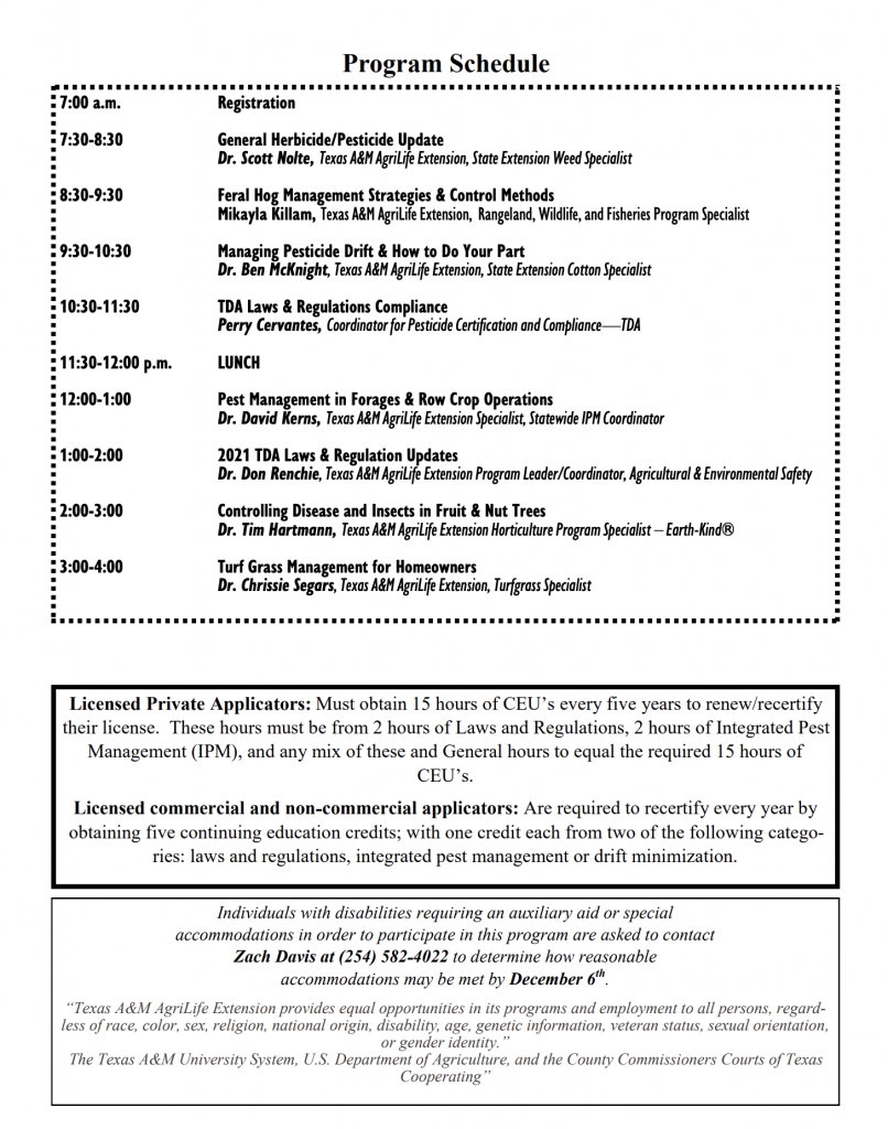 Private Applicators License holders must obtain 15 hours of CEUs every five years to renew/recertify their license. The seminar will provide attendees with the opportunity to receive up to eight (8) CEUs. Of the eight (8) hours, three (3) hours will be in General, two (2) hours in IPM, two (2) hours in Laws and Regulations and one (1) hour in Drift.