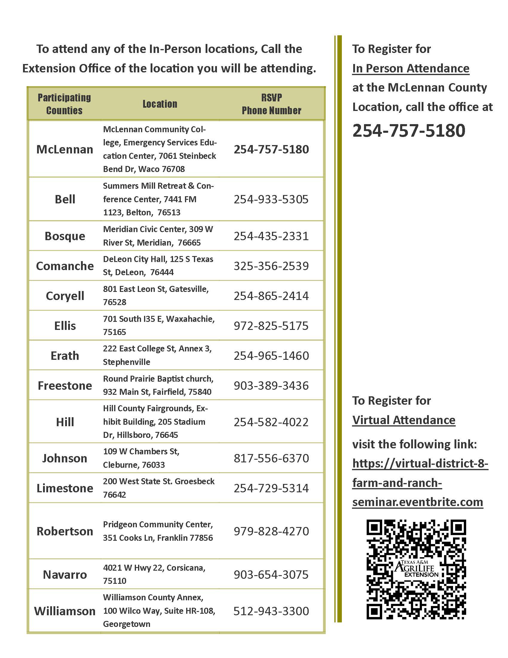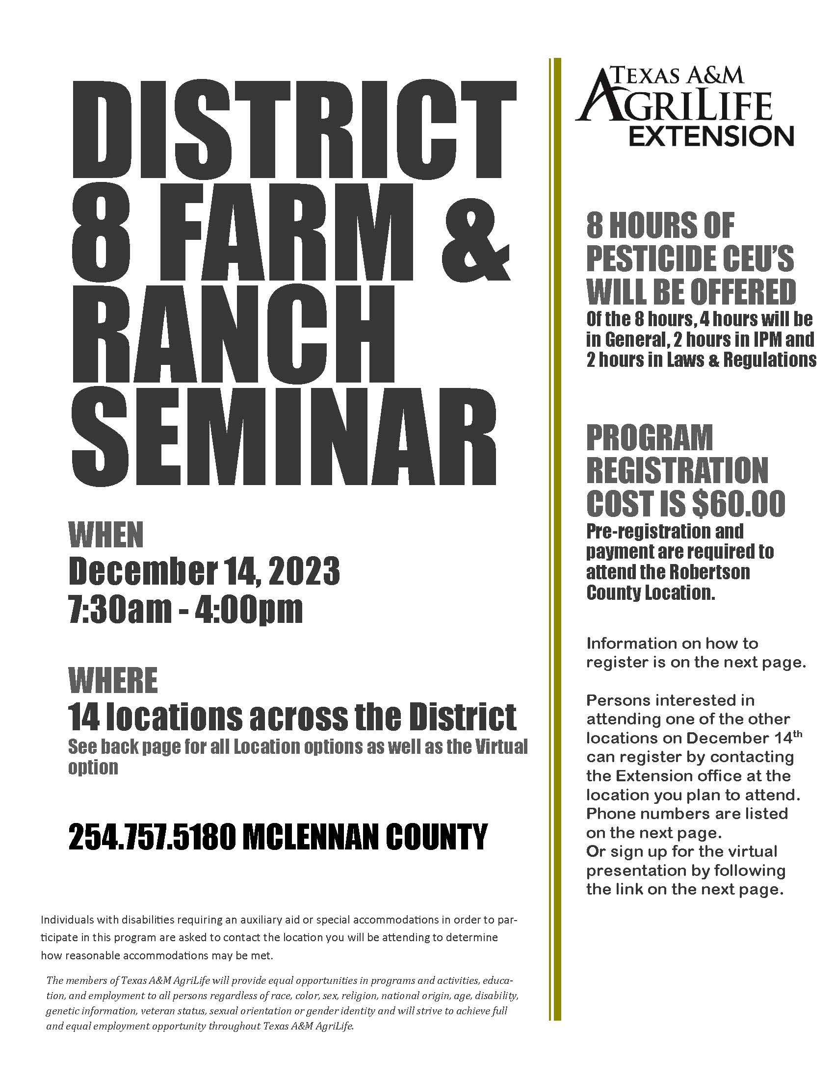 McLennan County Texas A&M Extension will host the District 8 Farm and Ranch Seminar. The seminar will allow participants to receive up to eight CEUs: four in General, two hours in IPM, and two hours in Laws and Regulations.