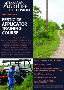 For anyone wanting to become a licensed pesticide applicator, Texas A&M AgriLife is offering a training with the TDA. The TDA requires a license for anyone who uses or supervises the use of pesticides, so take this opportunity to come learn!