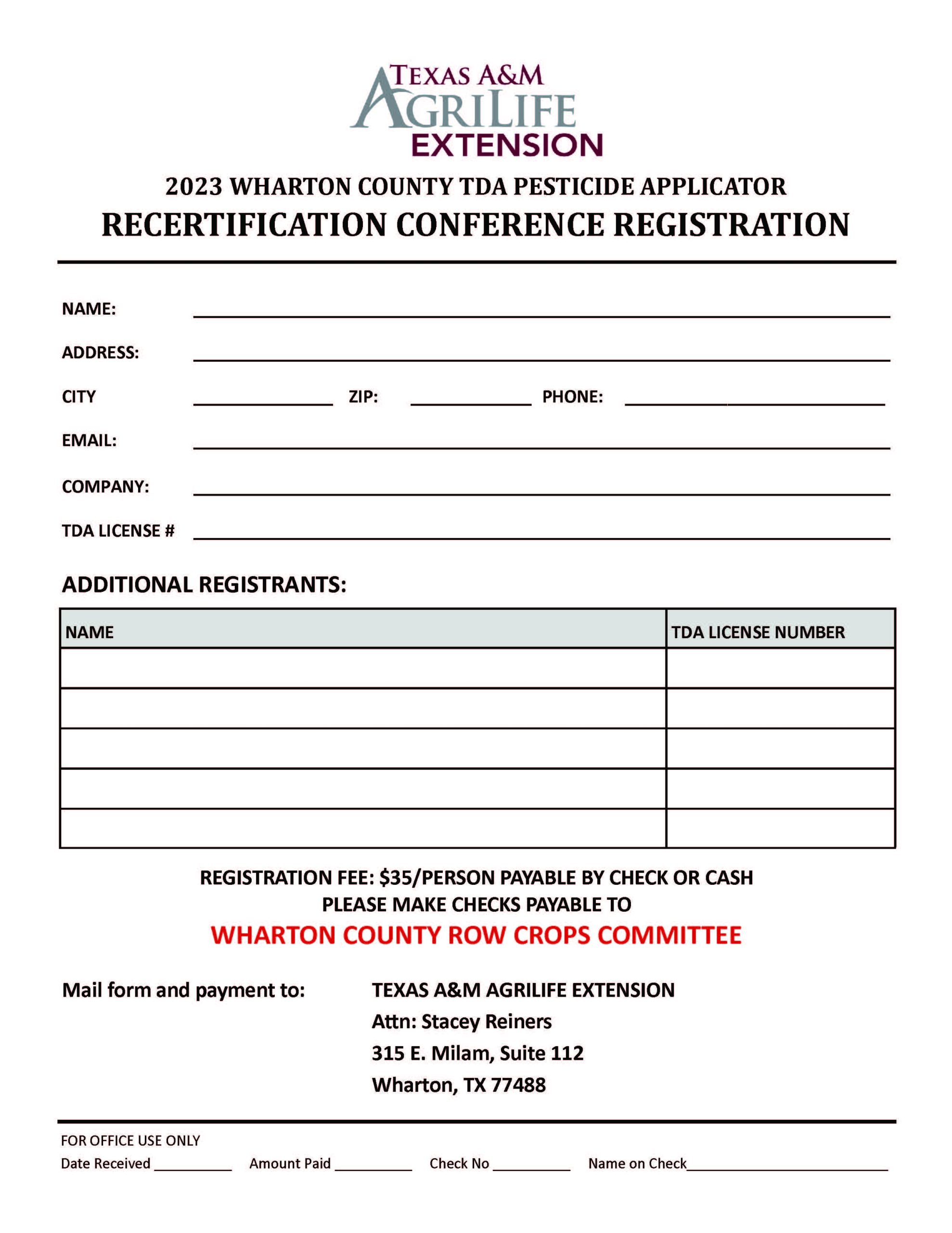 Are you in Wharton County & looking to earn CEUs? Then attend this CEU pesticide recertification program to earn 2 IPM, 1 Laws & Regulations and 2 General CEUs. Lunch is included.