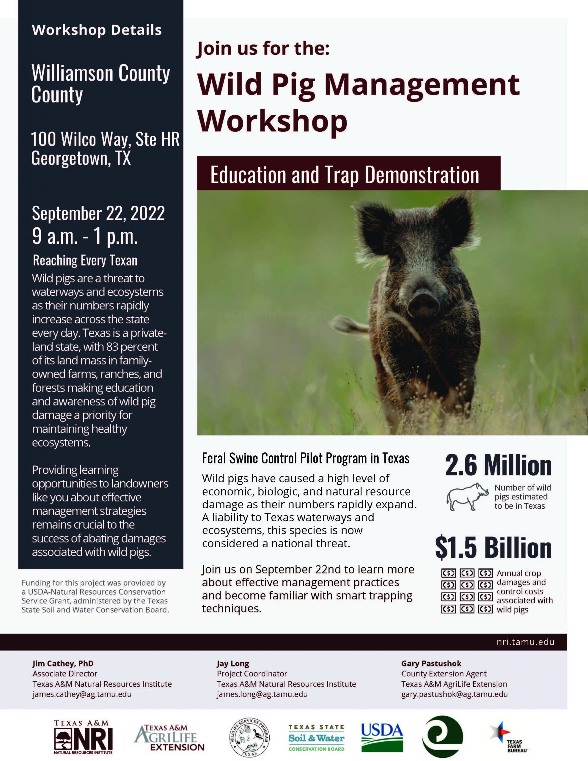Prevent wild hogs from making your crops and land a part of the $1.5 billion in damages annually. Take this workshop to learn effective management practices and smart trapping techniques. Protect yourself, your land and your crops.