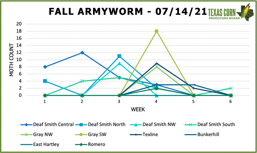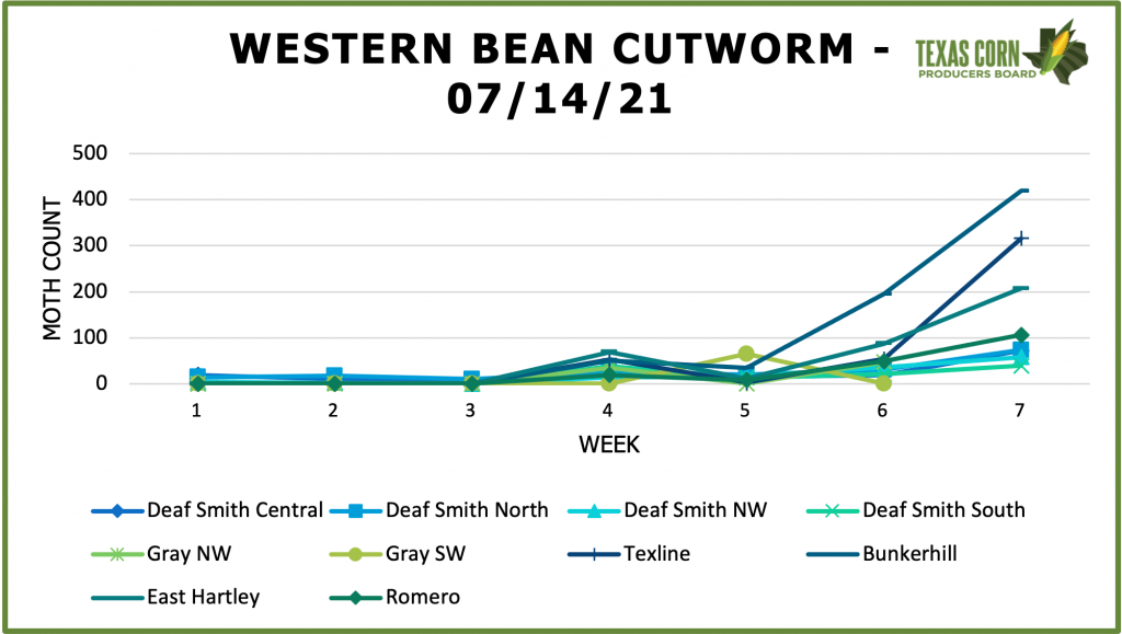 Over the past month Southwestern corn borer (Table 1) made its way into numerous traps primarily in Deaf Smith County, but these numbers have dropped in recent weeks.